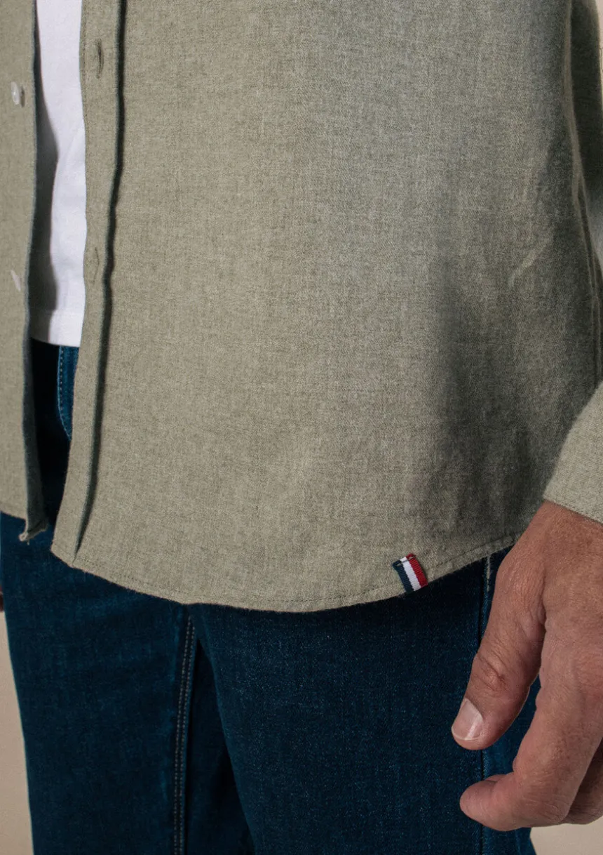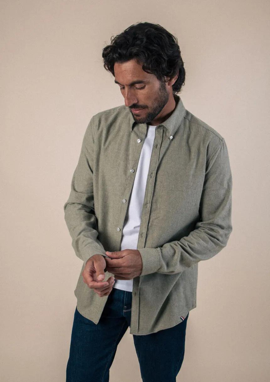 Notre chemise SAINT PAUL dans sa version unie se décline dans un beau vert chiné. À porter fermée ou ouverte sur un t-shirt blanc.
