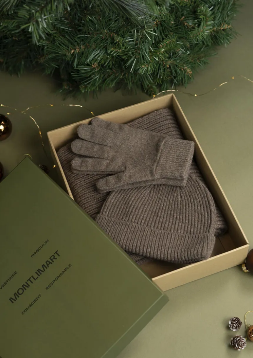 - Lot écharpe CHANTERELLE marron, bonnet PRAPOUTEL marron et gants PLEYNET marron avec un coffret cadeau Montlimart