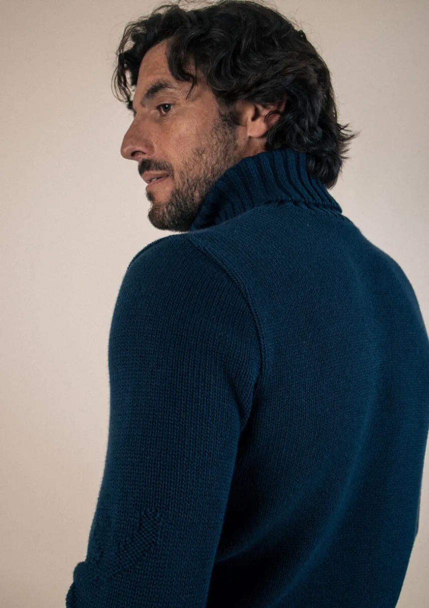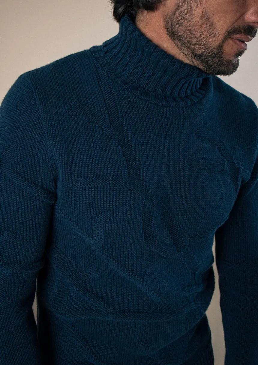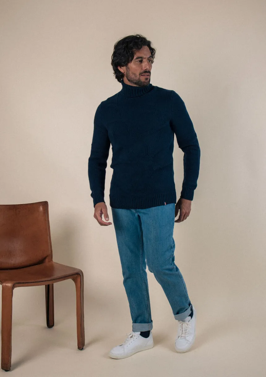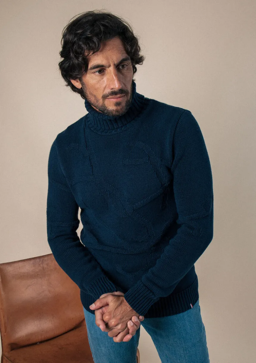 Avec son col roulé et sa maille tricotée de motifs branches, le pull HORAE marine donnera le ton de votre look : singulier et engagé.