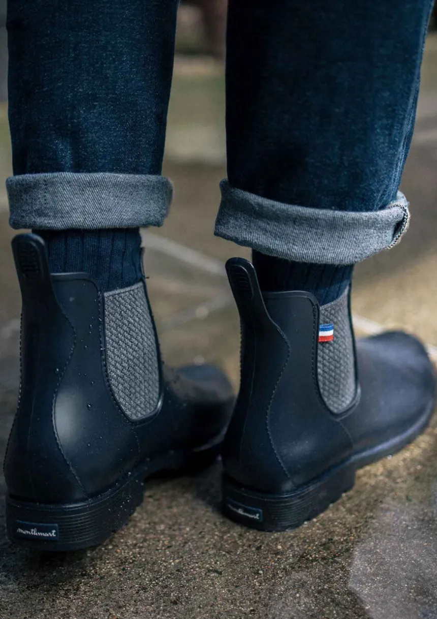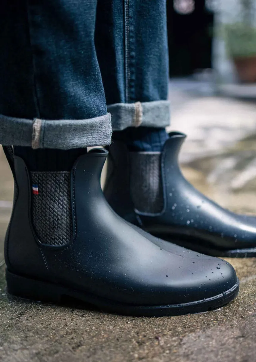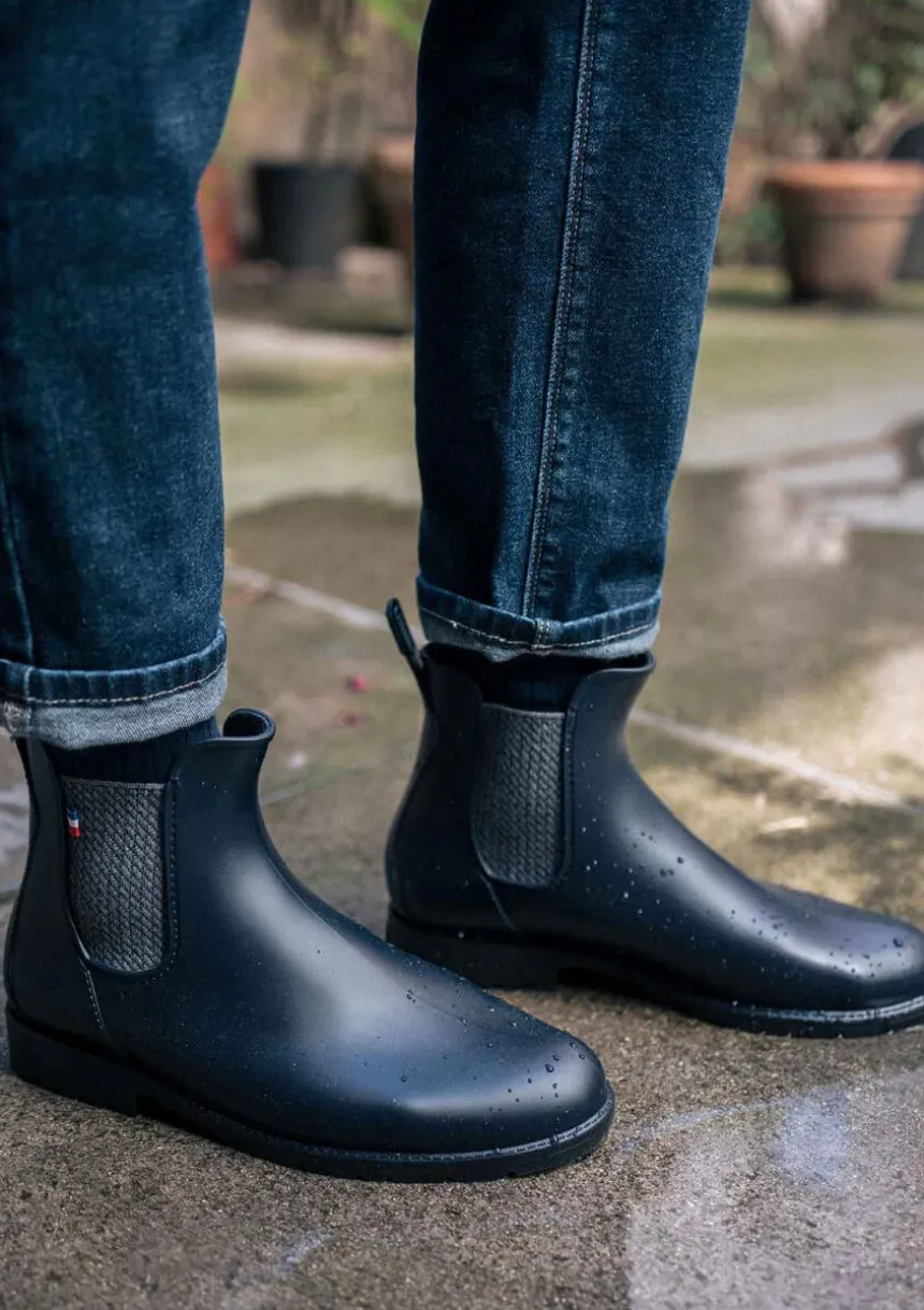 Notre bestseller : les boots MONTPLUIE. Ces bottines de pluie pour homme dans leur version marine à l’élastique jacquard seront les indispensables de votre vestiaire pour affronter les jours pluvieux avec style.