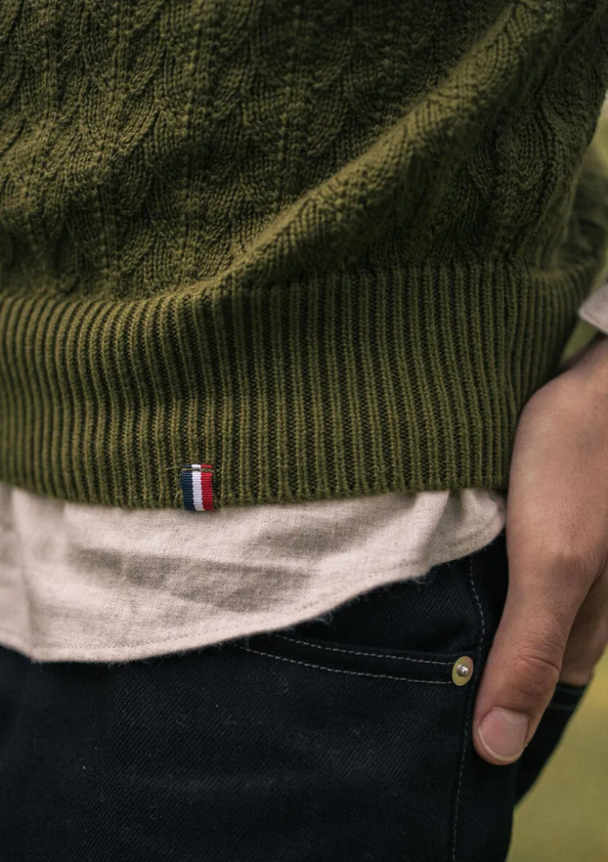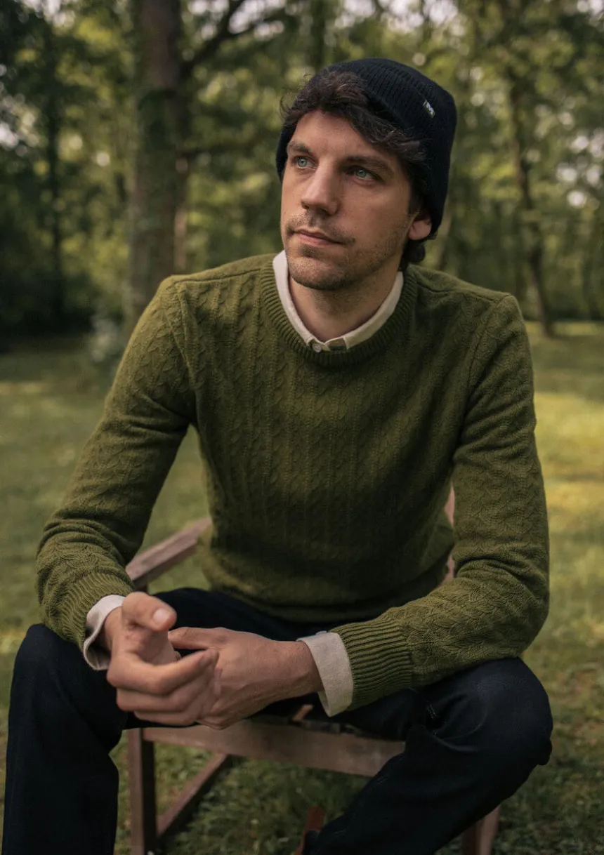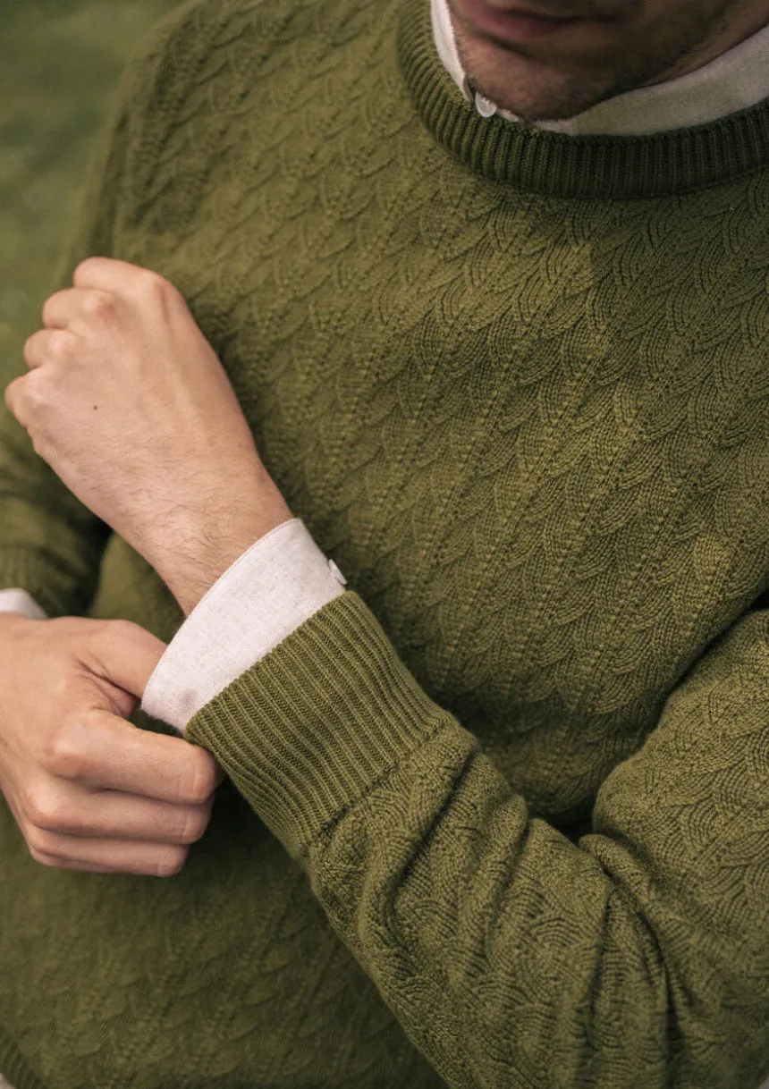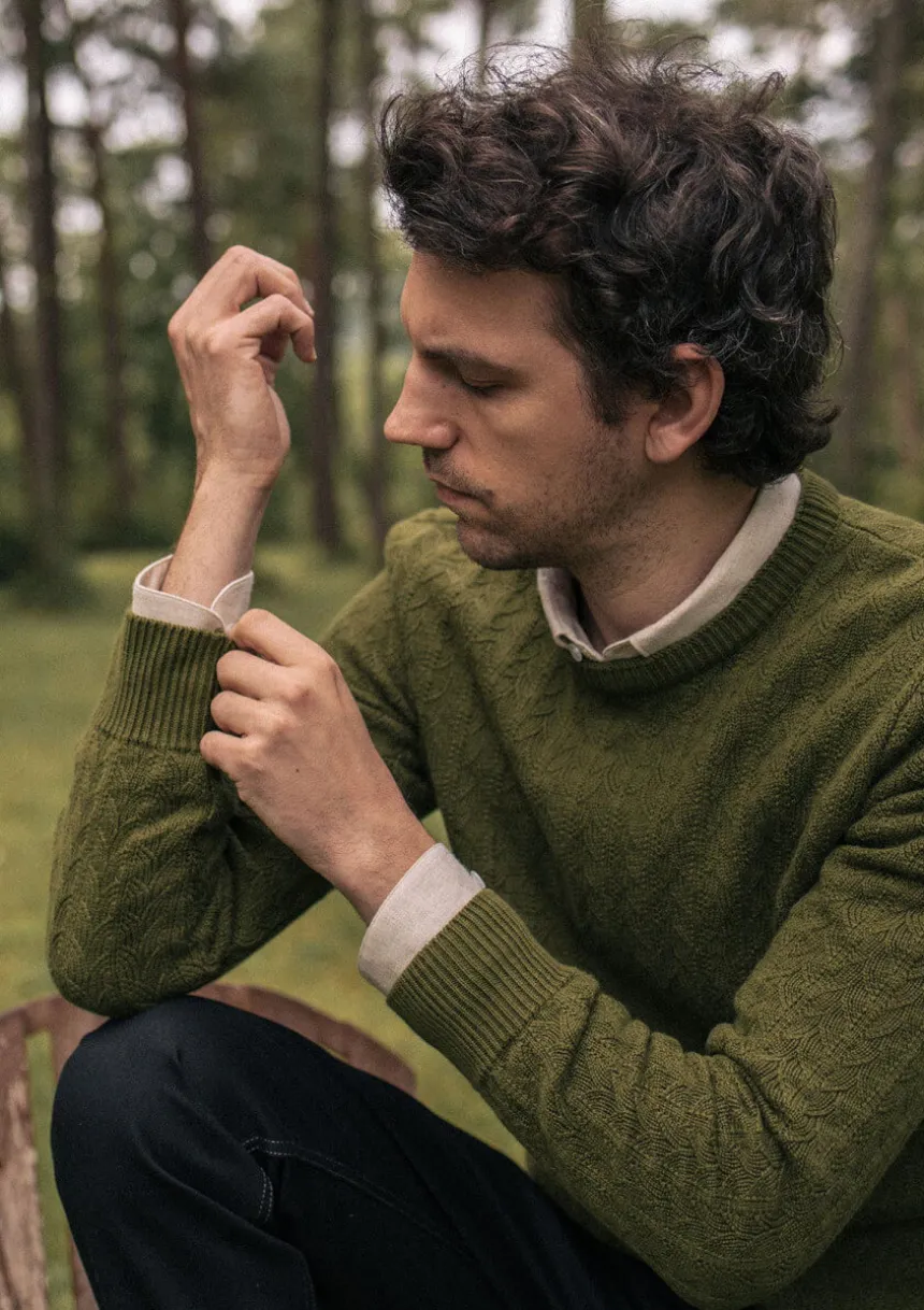 Avec sa maille 100% coton bio tricotée en forme de feuille, le pull TILLEUL vert donnera le ton de votre look : singulier et engagé en toute subtilité.