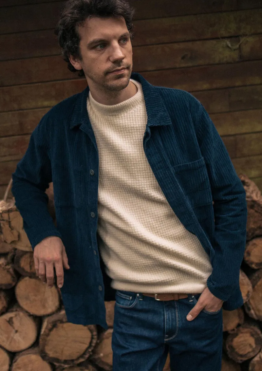 D’inspiration workwear, notre iconique veste ATELIER revisite le classique Bleu de Travail dans une version velours côtelé marine. Un incontournable du quotidien.